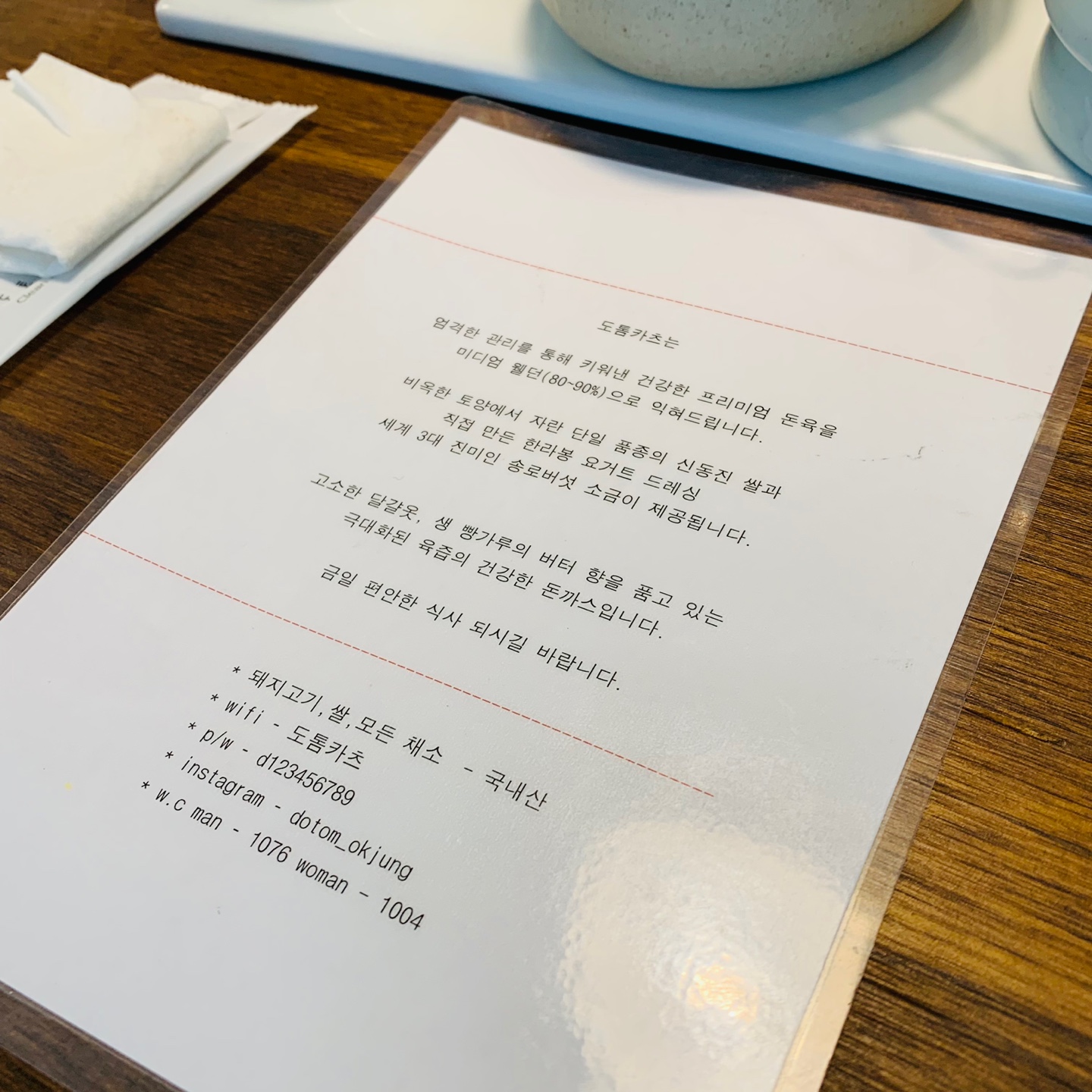 테이블에는 도톰가츠에 대한 설명과 와이파이 및 인스타그램, 화장실 비밀번호까지 안내되어 있어요.