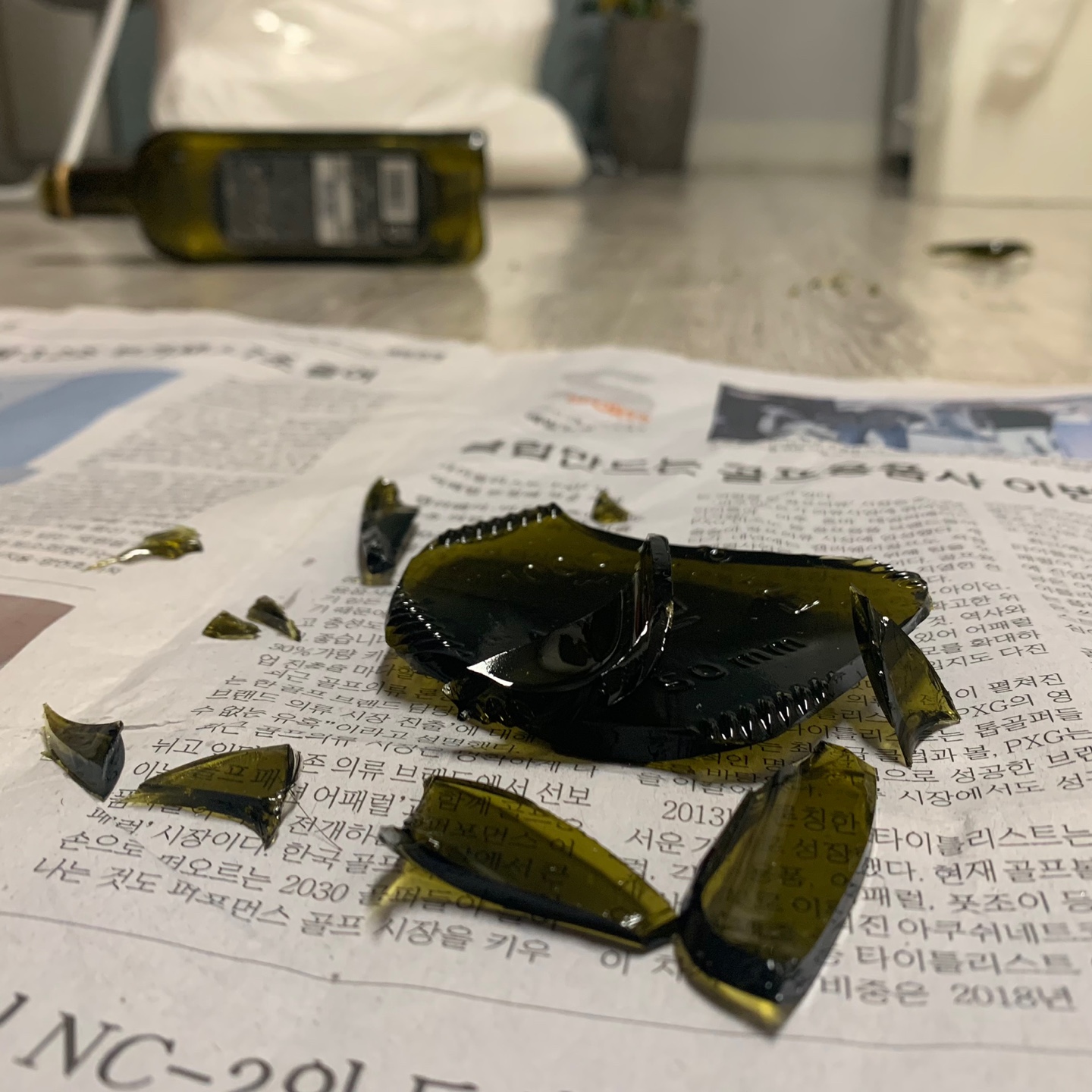 올리브병은 이미 깨져 버렸고 바닥에 떨어진 유리 파편들은 최대한 치우면 된다.