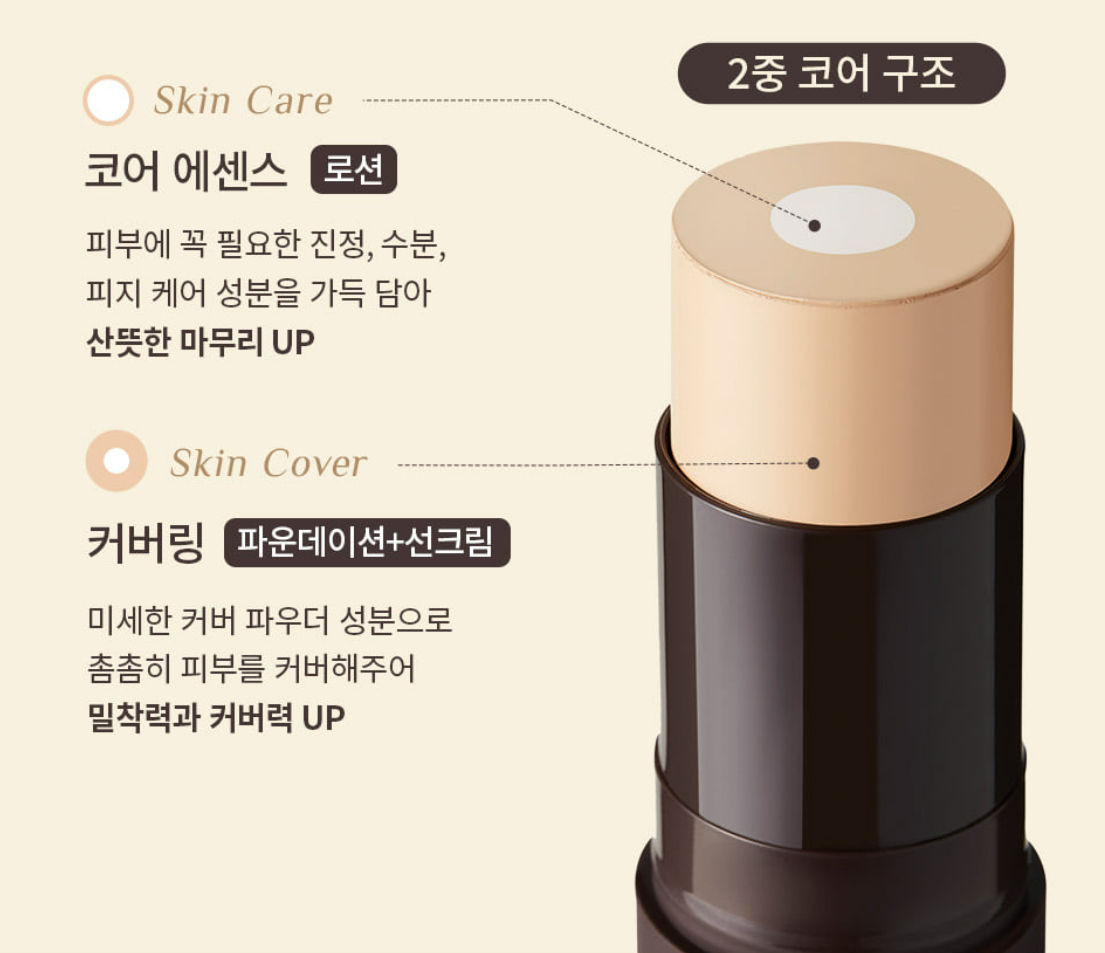 두 가지 2중 코어 구조로 되어 있어 하얀 부분은 로션 기능, 갈색 부분은 커버링 기능을 합니다.