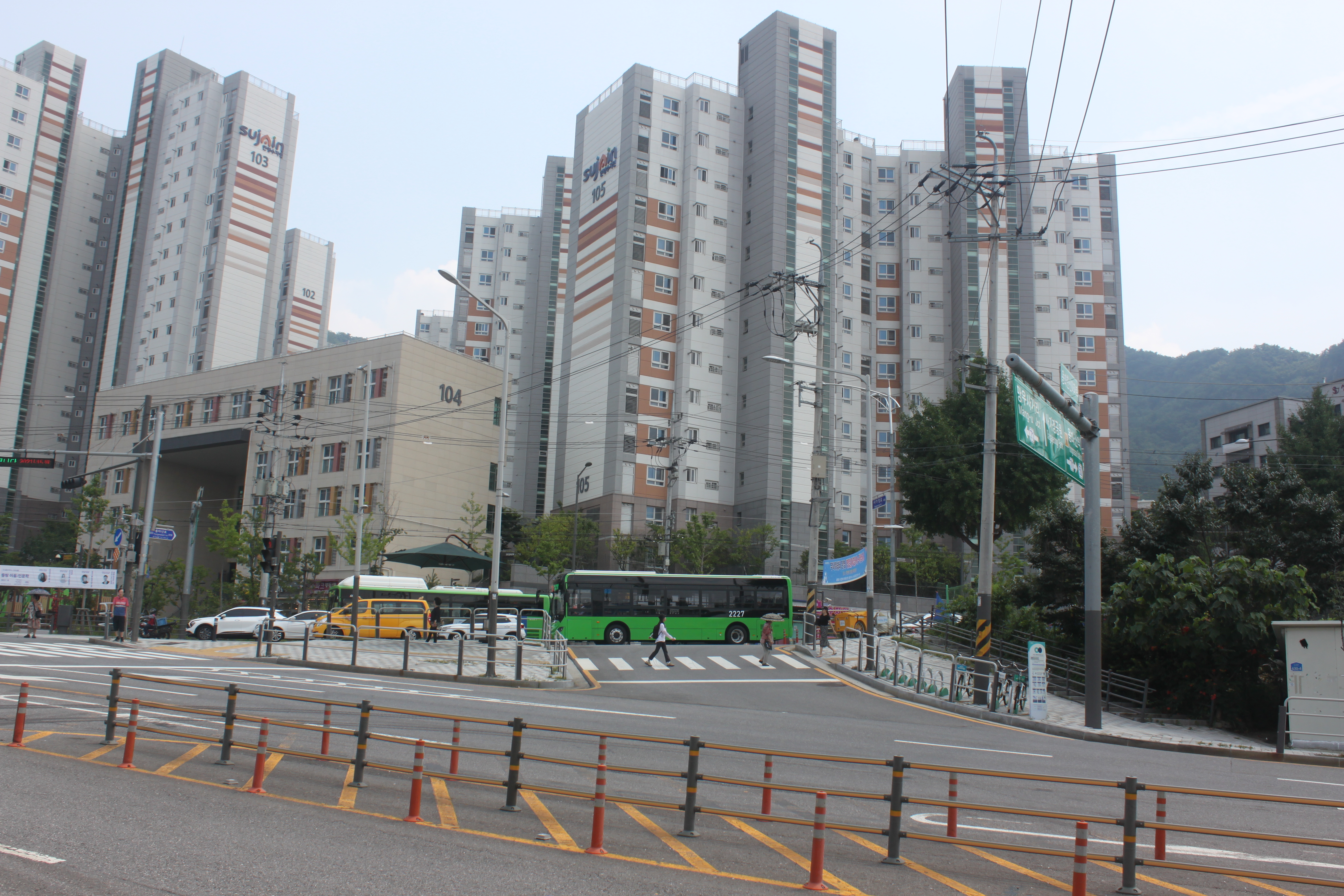 지하철역 기준으로 생각하면 사가정역 4번 출구에서 앞으로 쭉 올라와서 용마로 주유소 앞 횡단보도를 건너 언덕으로 올라옵니다. 사진상으로 초록색 버스가 있는 곳으로 올라가는 겁니다.