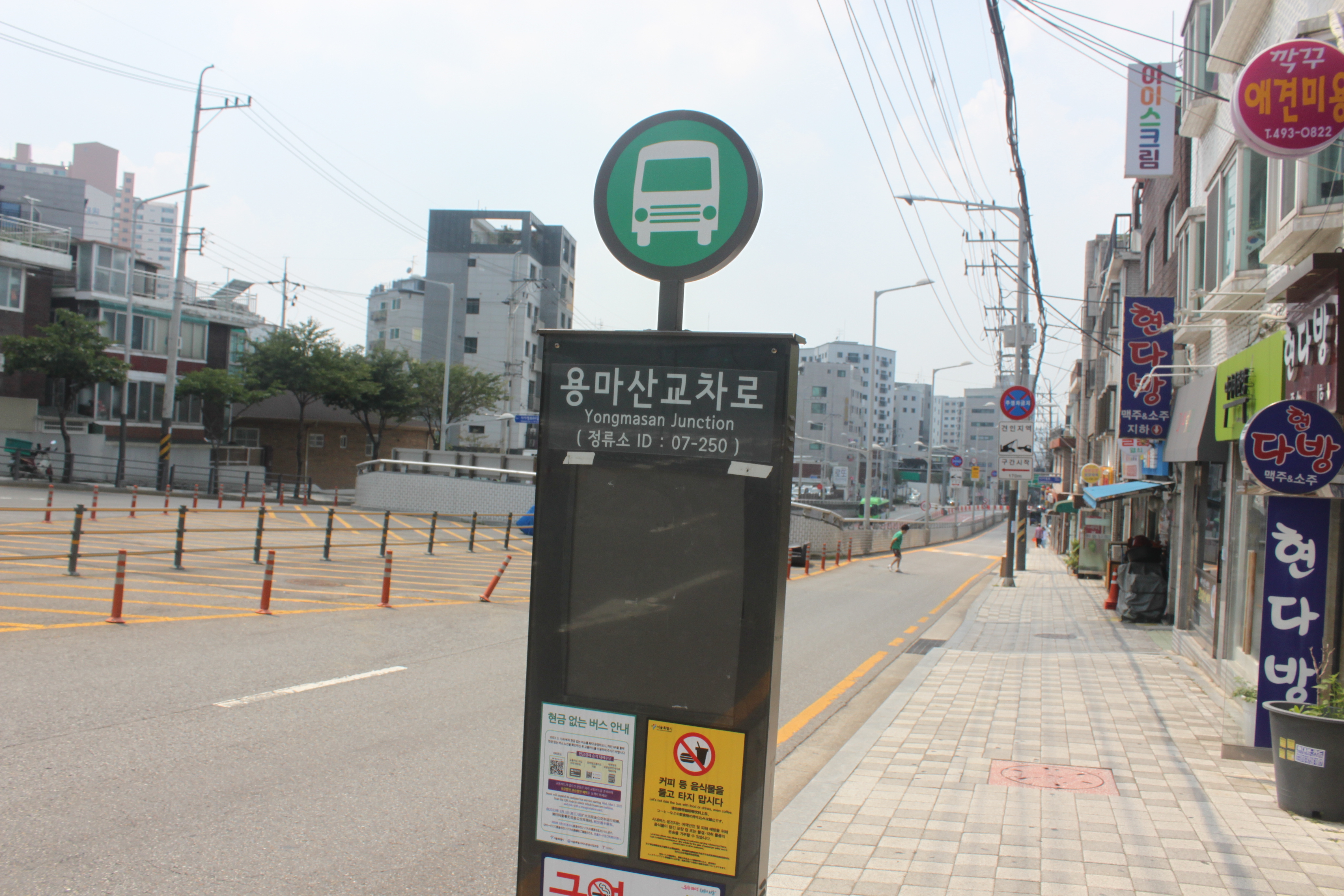 언덕을 타고 올라오면 용마로 주유소가 보이고 횡단보도를 건넙니다.